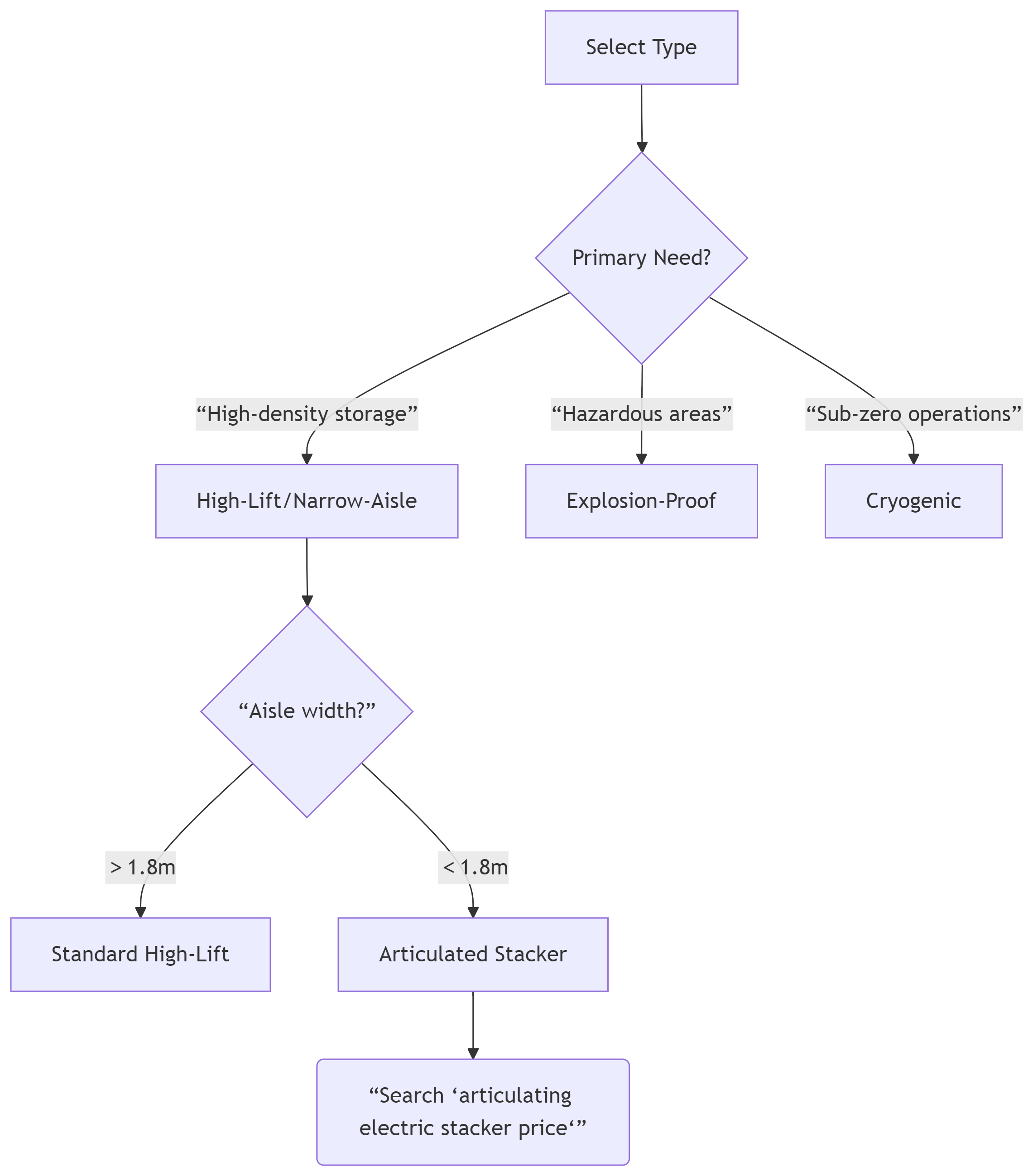 Tipo Aisle Width Target Keyword Tri-Directional 1.6-1.8m "tri-directional electric stacker"Articulated 1.4-1.6m "articulating narrow reach truck"3. Explosion-Proof Electric Pallet Jacks